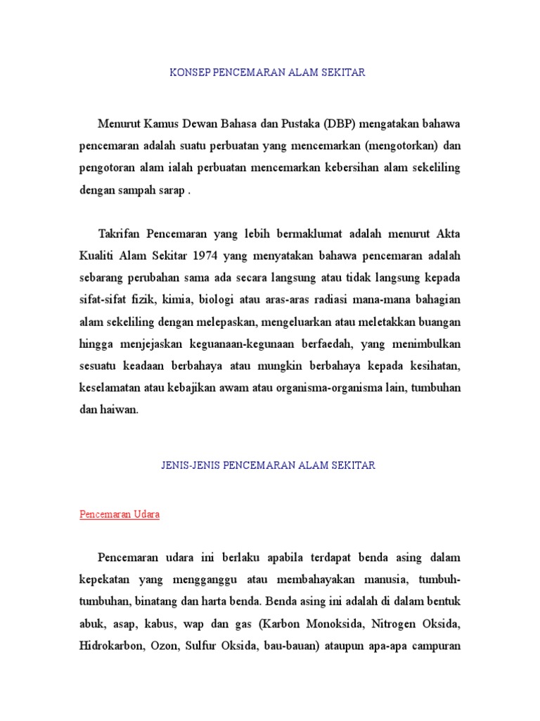 Pada pendapat saya isu pencemaran alam sekitar tidak boleh dipandang ringan oleh ahli masyarakat. Jenis jenis pencemaran alam sekitar. Pencemaran boleh dimaksudkan sebagai percampuran sesuatu benda atau perkara yang tercemar masuk ke dalam sesuatu perkara yang positif. Perkara tercemar tersebut akan memberikan kesan kesan yang buruk kepada alam sekitar budaya dan bangsa sekiranya tidak di tangani.