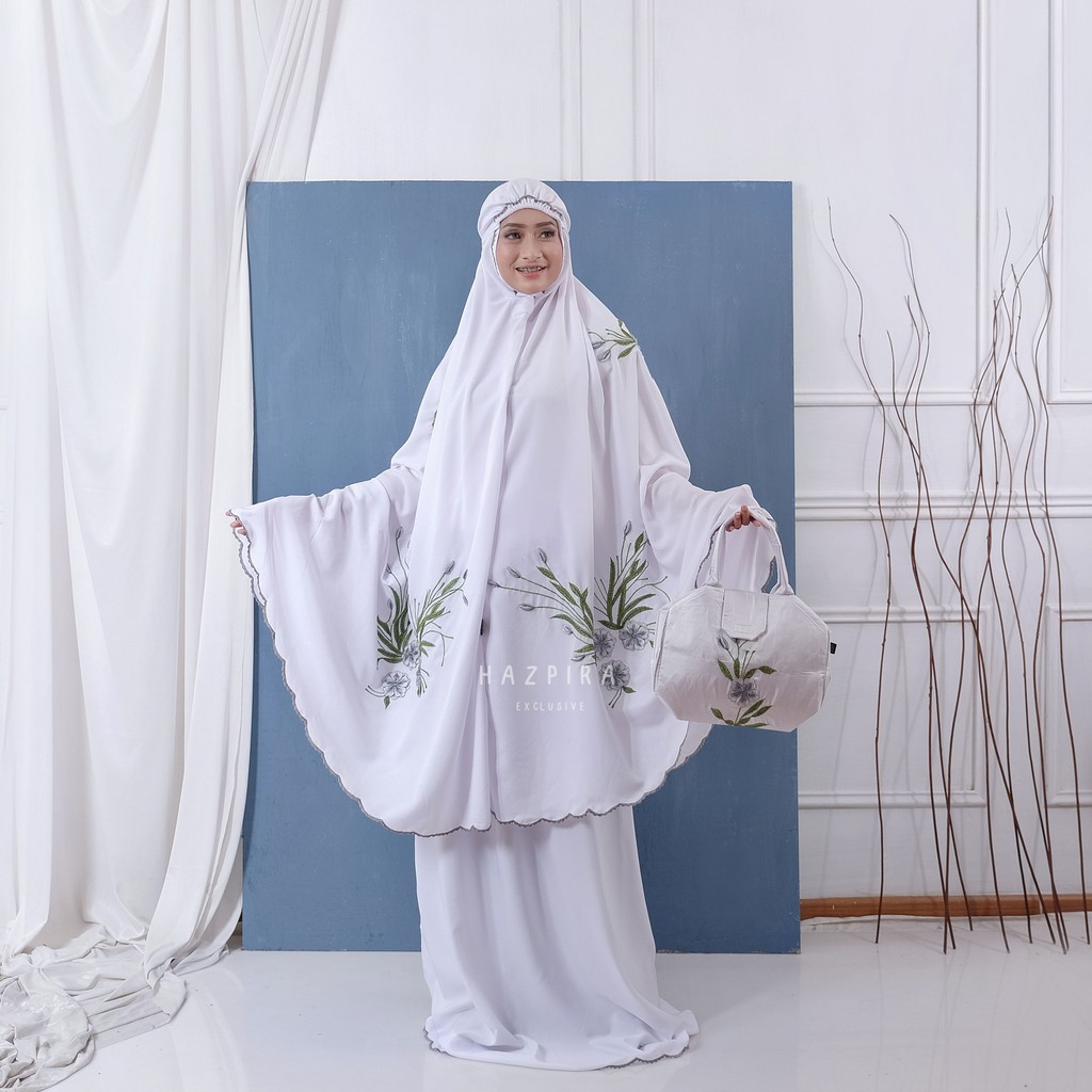 Mukena Bali Murah Warna Putih Corak Bunga Tulip Angin Cemara Fashion