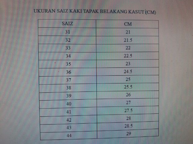 Saiz Kasut Dewasa Malaysia