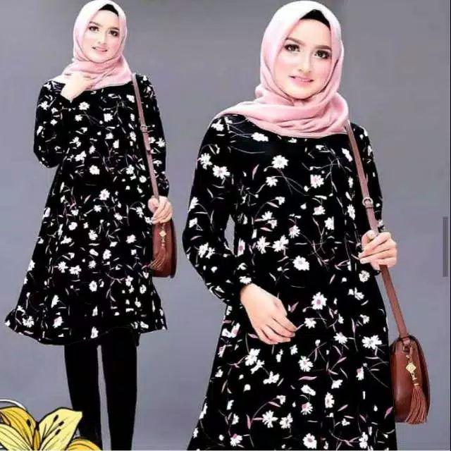 Jual Baju Atas Wanita Tunik Lamia Motif Bunga Hitam Fit To Xl